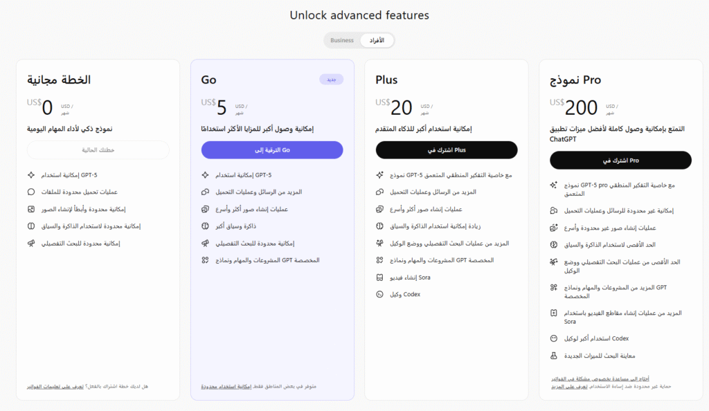 • اختر ChatGPT Go إذا: كنت مستخدمًا منتظمًا وتريد ميزات أفضل من الخطة المجانية (مثل رسائل أكثر ورفع ملفات) بسعر معقول.